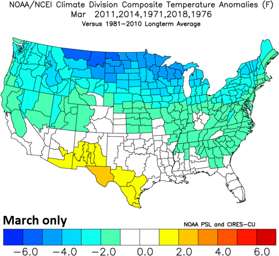 Precipitation anomalies averaged together for the month of February (top) in the 5 analog years and temperature anomalies averaged together for the month of March (bottom). Much of the precipitation in the analog years fell in the latter stages of the winter season and colder-than-normal conditions lasted well into the month of March. Data courtesy NOAA