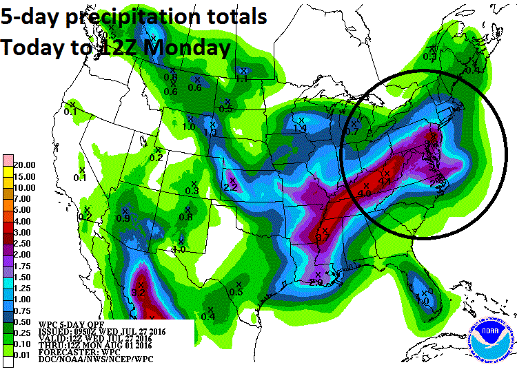 5-day precipitation totals between today and 8AM Monday; courtesy NOAA