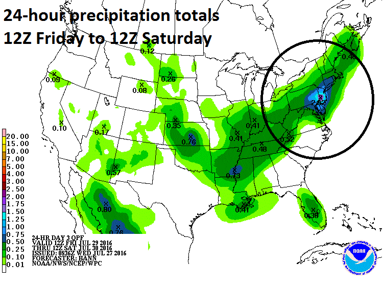 More than three inches of rain can fall in portions of the Mid-Atlantic region over the next five days as multiple low pressure systems ride along a stalled out frontal boundary zone from the Deep South into this area. Precipitable water amounts will be quite high at the end of the work week and during the weekend with abundant moisture ready to be squeezed out of the atmosphere. The first low pressure system to affect us with showers and thunderstorms will likely arrive later tomorrow night and continue into Friday. Some of the rain with this system could be heavy at times and there can be strong thunderstorms.