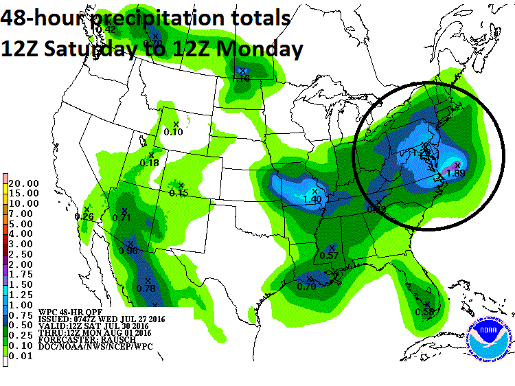 48-hour precipitation totals from 8AM Saturday and 8AM Monday; courtesy NOAA