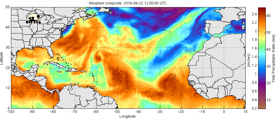 72 hour loop of "total precipitable water" where moist air is represented by orange, yellow, dry air by blue, green; courtesy University of Wisconsin/CIMSS