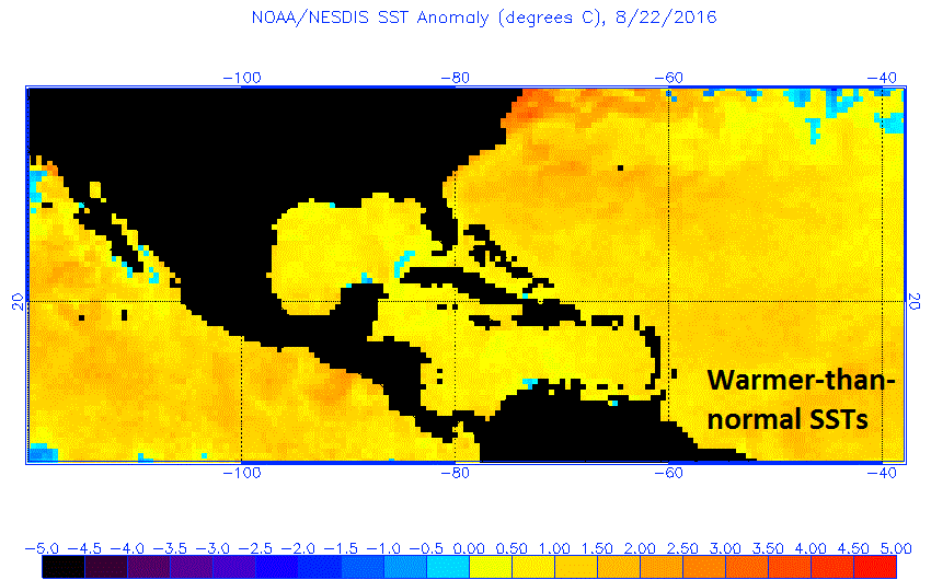 Sea surface temperatures are warmer-than-normal in most of the western Atlantic, Caribbean Sea, and Gulf of Mexico; courtesy NOAA