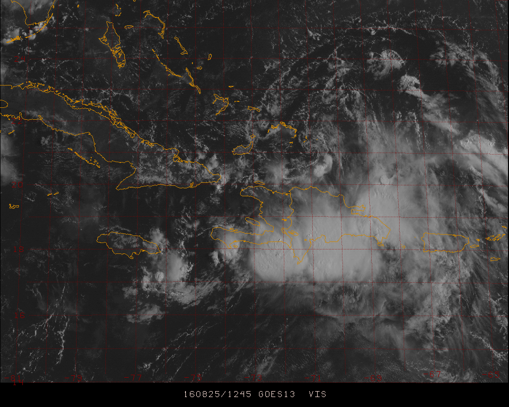 Recent GOES visible satellite image with showers/thunderstorms over Hispaniola; low-level circulation center may be north of the island; courtesy Penn State eWall, NOAA