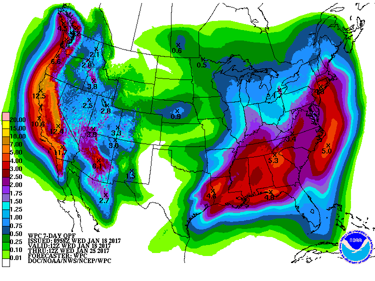 NOAA's forecast map of total precipitation amounts over the next 7 days