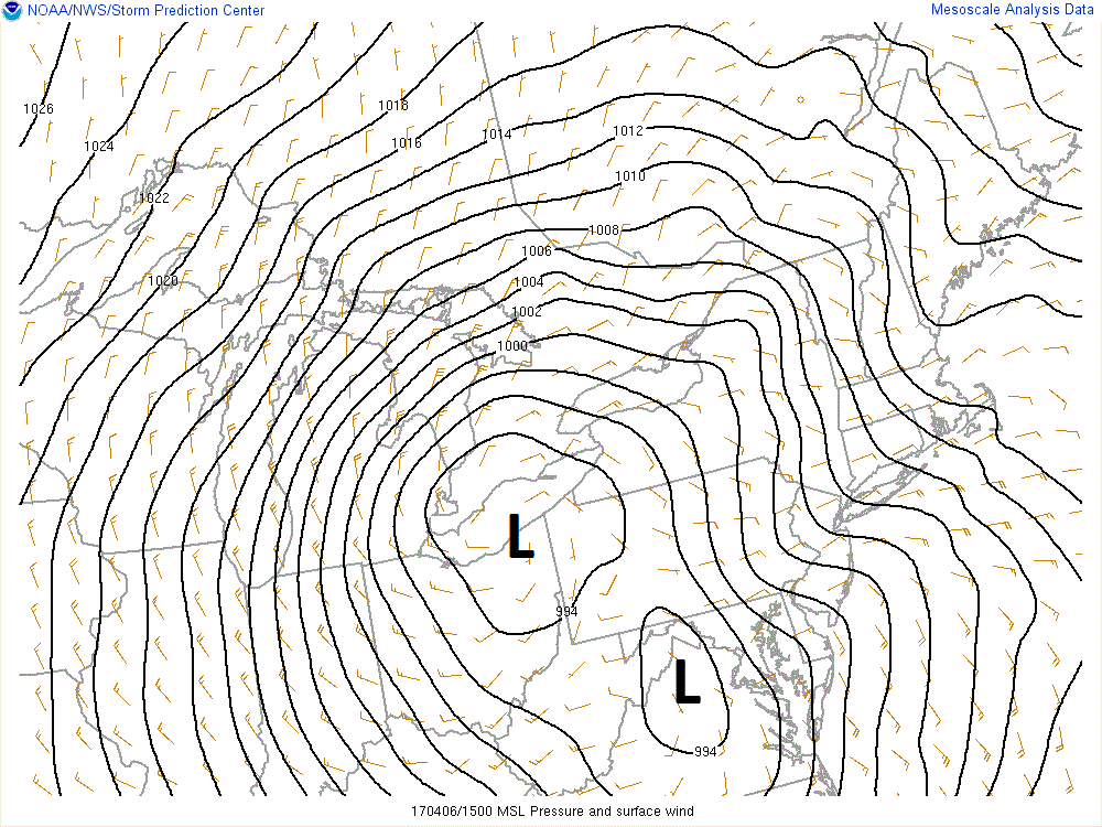 Surface isobar (pressure) pattern with developing major (secondary) storm system in NW Virginia and weakening (initial) storm over NE Ohio; map courtesy NOAA