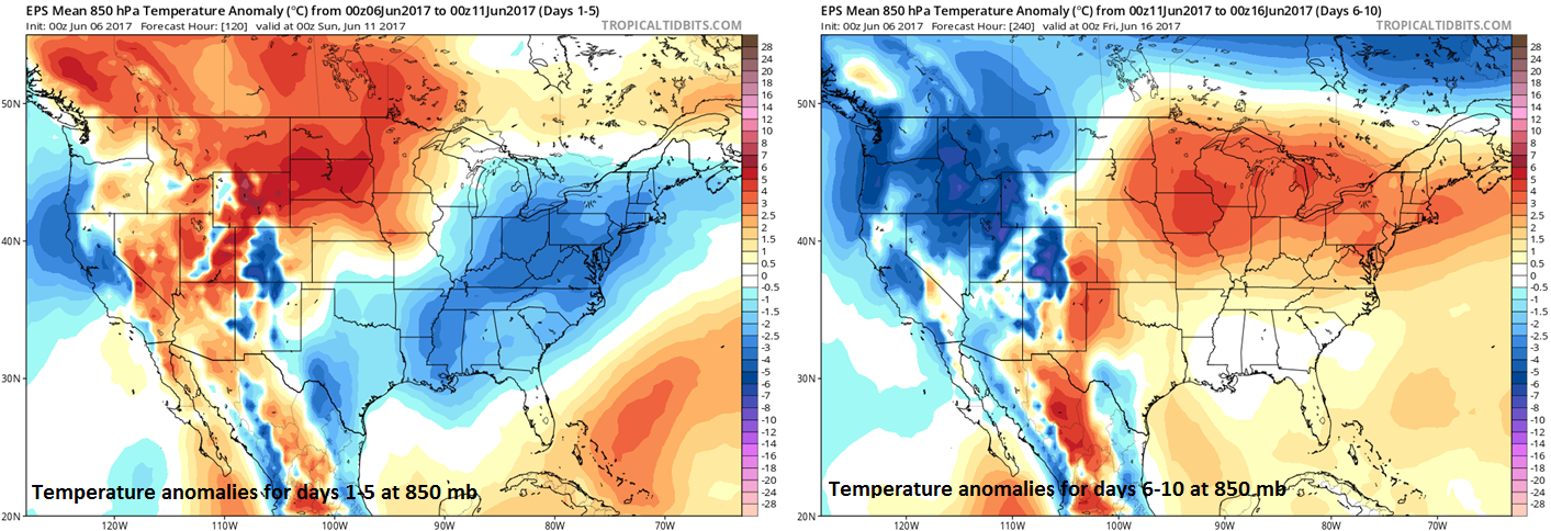 00Z Euro ensemble model forecast maps of 5-day average 850 mb temperature anomalies for days 1-5 (left) and days 6-10 (right); maps courtesy tropicaltidbits.com