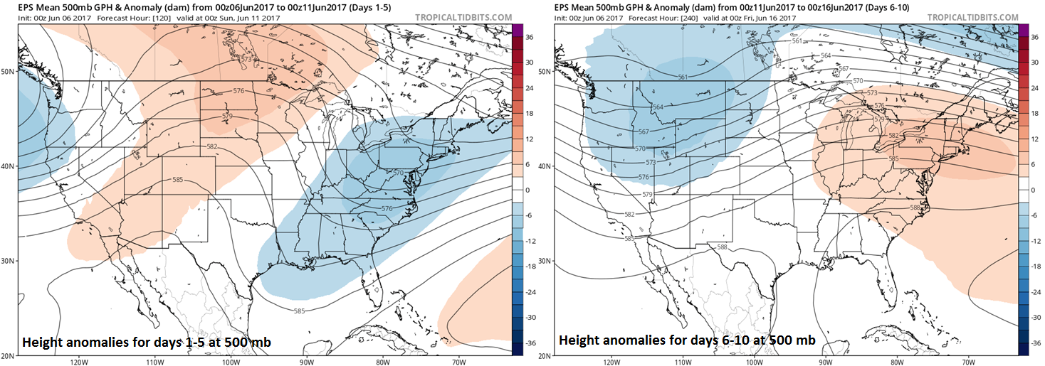 00Z Euro ensemble model forecast maps of 5-day average 500 mb height anomalies for days 1-5 (left) and days 6-10 (right); maps courtesy tropicaltidbits.com