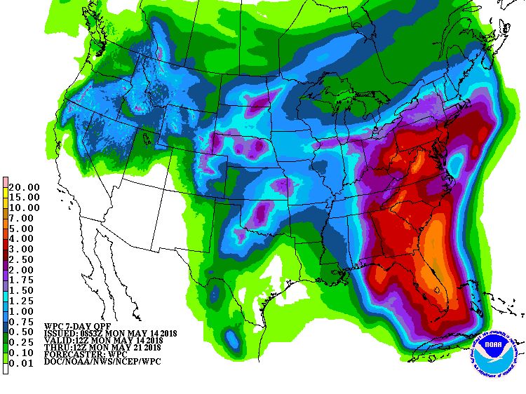 NOAA's forecast map of total rainfall amounts over the next seven days...excessive levels are predicted throughout the eastern third of the nation; map courtesy NOAA