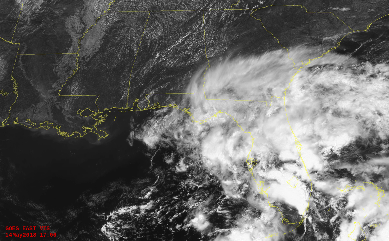 Latest visible satellite view of the Southeast US with tropical moisture impacting Florida. This moisture will push northward over the next few days and contribute to excessive rainfall amounts over the next week or so in much of the eastern third of the nation; image courtesy NOAA/GOES, Penn State eWall