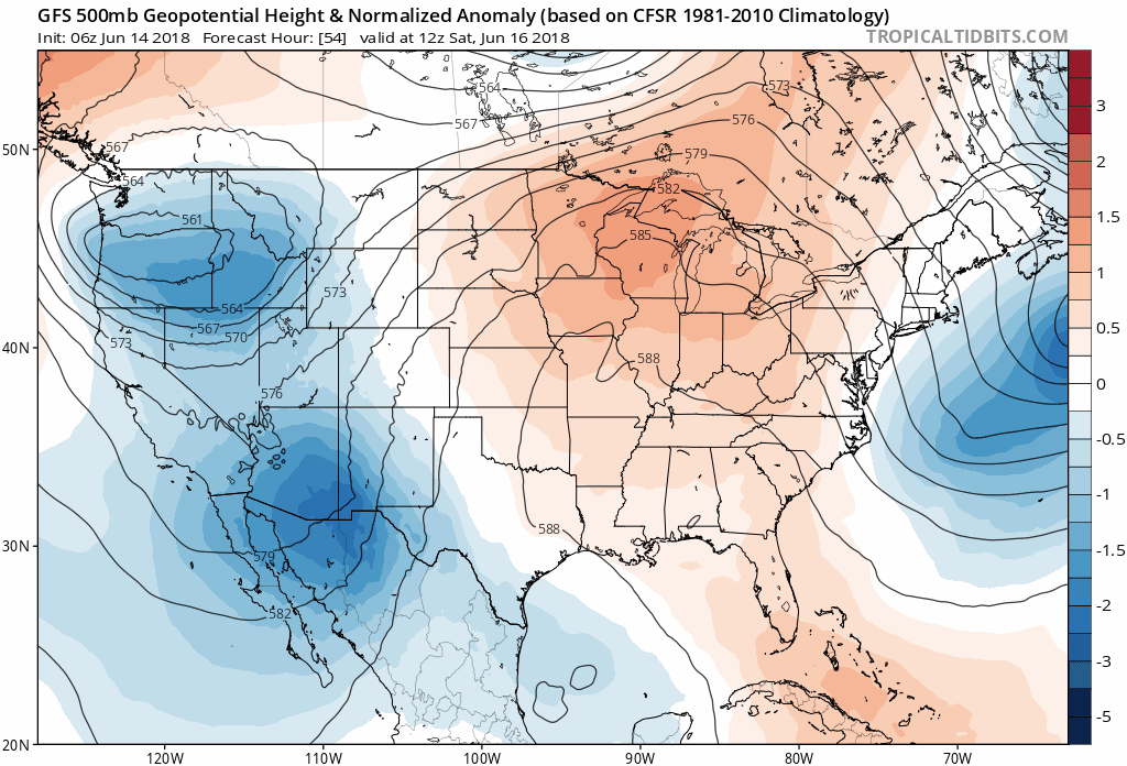 06Z GFS forecast maps of 500 mb height anomalies from Saturday morning (forecast hour 54) to Monday morning (forecast hour 102) with high pressure ridging reaching its peak relative-to-normal on Monday, June 18th, in the Mid-Atlantic region; courtesy NOAA/EMC, tropicaltidbits.com
