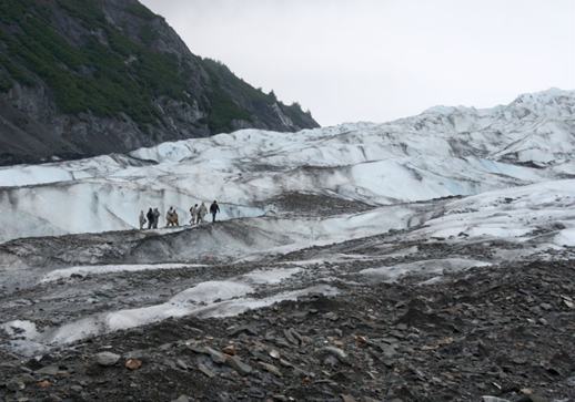 A group of visiting military members stand on Colony Glacier above the aircraft debris field actively being excavated during June 2017; (Photo courtesy Laurel Andrews/Alaska Dispatch News)