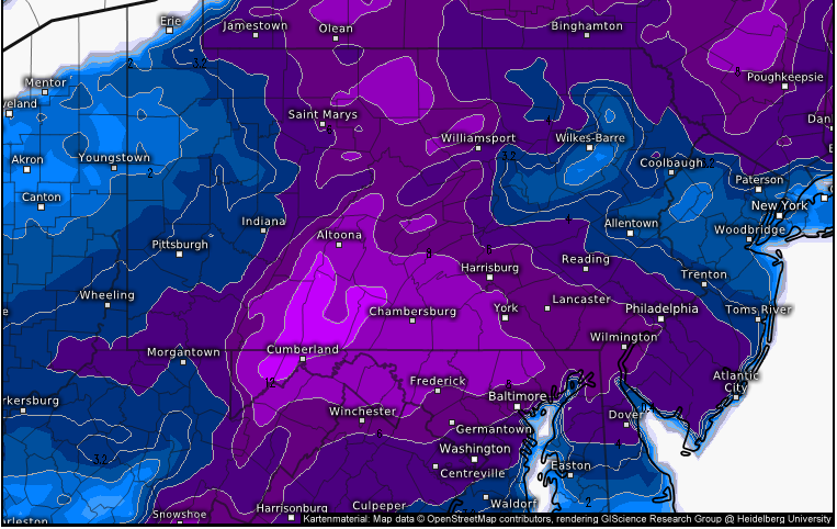 Low pressure will head our way later and although it is a fairly fast-mover, it is likely to have some impact on the Mid-Atlantic region; especially, to the north and west of the big cities. Snow, ice and rain is likely in areas to the north of the PA/MD border from late today into early Monday and a mix of ice and rain is expected to the south of there. Road conditions can become slick in all areas during the nighttime hours and into early Monday morning with possible small accumulations of snow and/or ice. By the middle of the week, we’ll have to deal with a stronger storm and this one could result in significant snow accumulations for much of the Mid-Atlantic region followed by ice and rain.