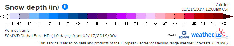 00Z Euro snow depth map by midnight Thursday; courtesy ECMWF, weather.us