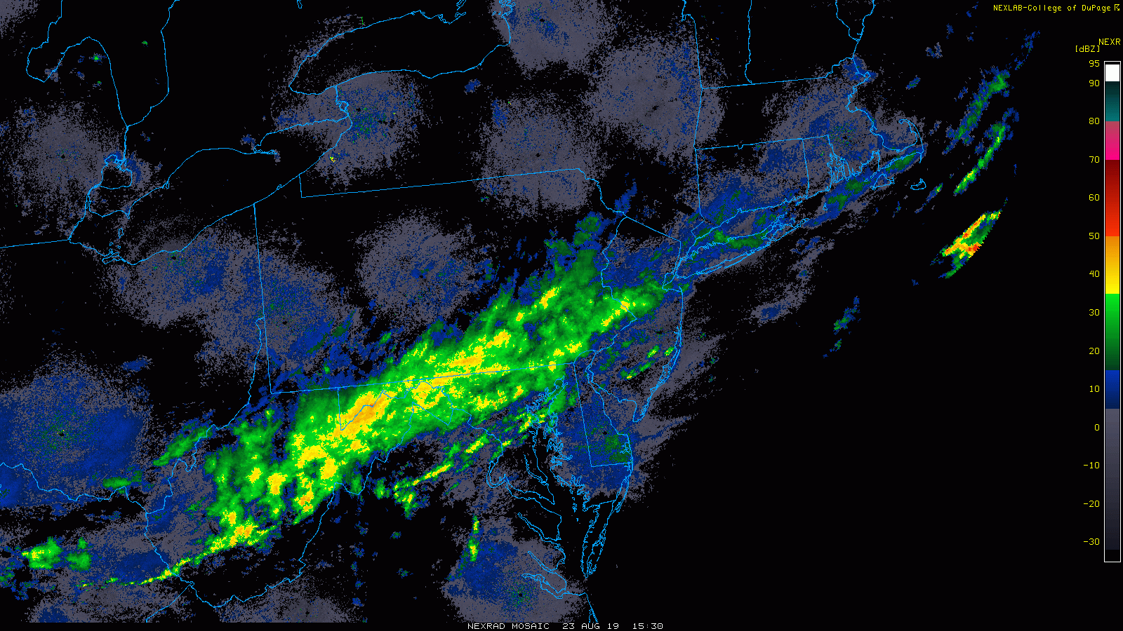A cold front is only very slowly working its way through the Mid-Atlantic region at mid-day from northwest-to-southeast and this will result in additional rainfall for much of the day in DC, Philly and NYC. Courtesy NOAA, College of DuPage