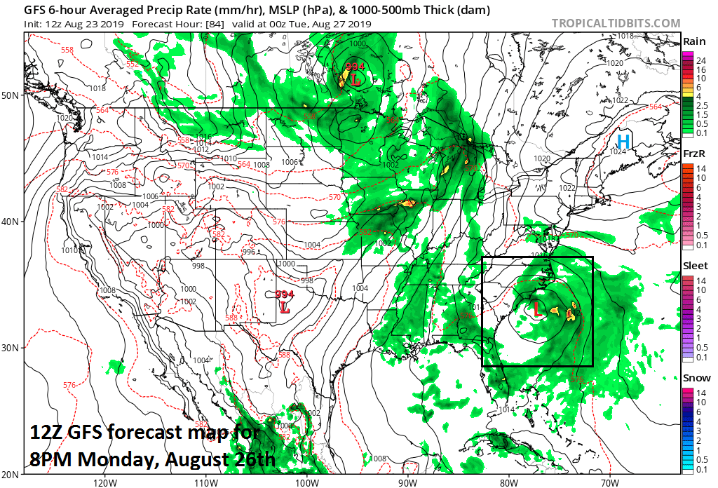 12Z GFS forecast map for Monday evening indicates low pressure off the Carolina coastline and this could be a named (‘Dorian’) tropical storm by this time; courtesy NOAA, tropicaltidbits.com