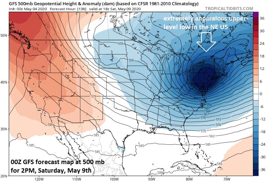 An extremely anomalous upper-level low will likely be situated over the Northeast US by the early part of this upcoming Mother’s Day weekend. Map courtesy NOAA, tropicaltidbits.com