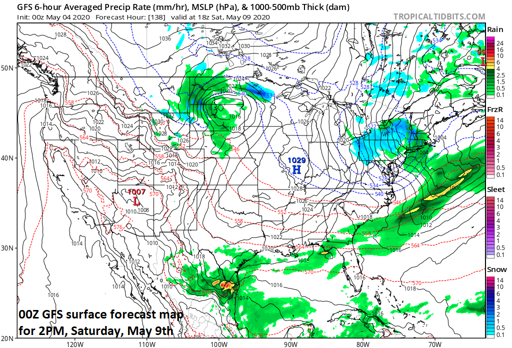 All signs point to an unusually cold air outbreak for the central and eastern US late this week and for the upcoming Mother’s Day weekend. Some computer forecast models suggest near record lows for a large region of the country extending from the central US to the eastern seaboard. One example that the upcoming air mass means business is a forecast by the 00Z Euro of around -10 degrees (C) at ~5000 feet over Pittsburgh on Saturday morning - the lowest temperature at that level since the 1950’s is -9.3 degrees (C) for the entire month of May.
