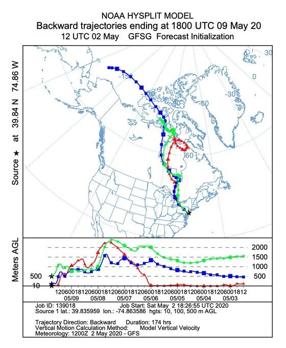 This “backward trajectory” forecast map indicates the air mass coming to the Mid-Atlantic region by the early part of the upcoming weekend will have its origins north of Alaska. Map courtesy NOAA