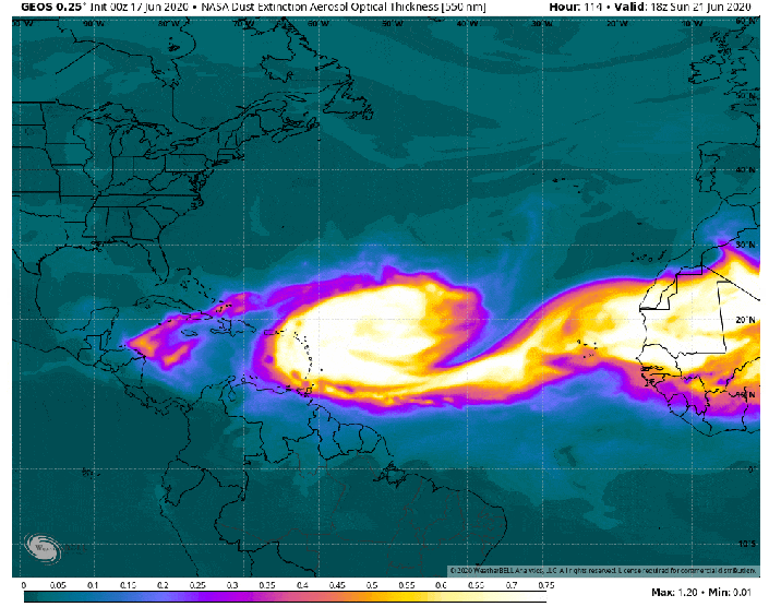 NASA GEOS-5 global atmospheric model forecast maps of dust extinction between June 17 and June 27. Maps courtesy NASA, Weather Bell Analytics