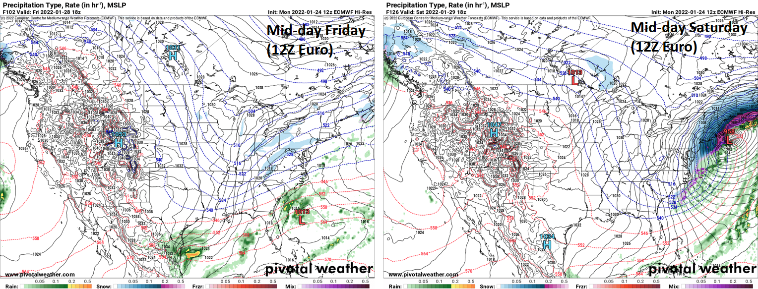 12Z Euro has an explosive intensification of the late week/early weekend storm with a drop of 55 millibars between mid-day Friday (left) and mid-day Saturday (right). Maps courtesy ECMWF, Pivotal Weather