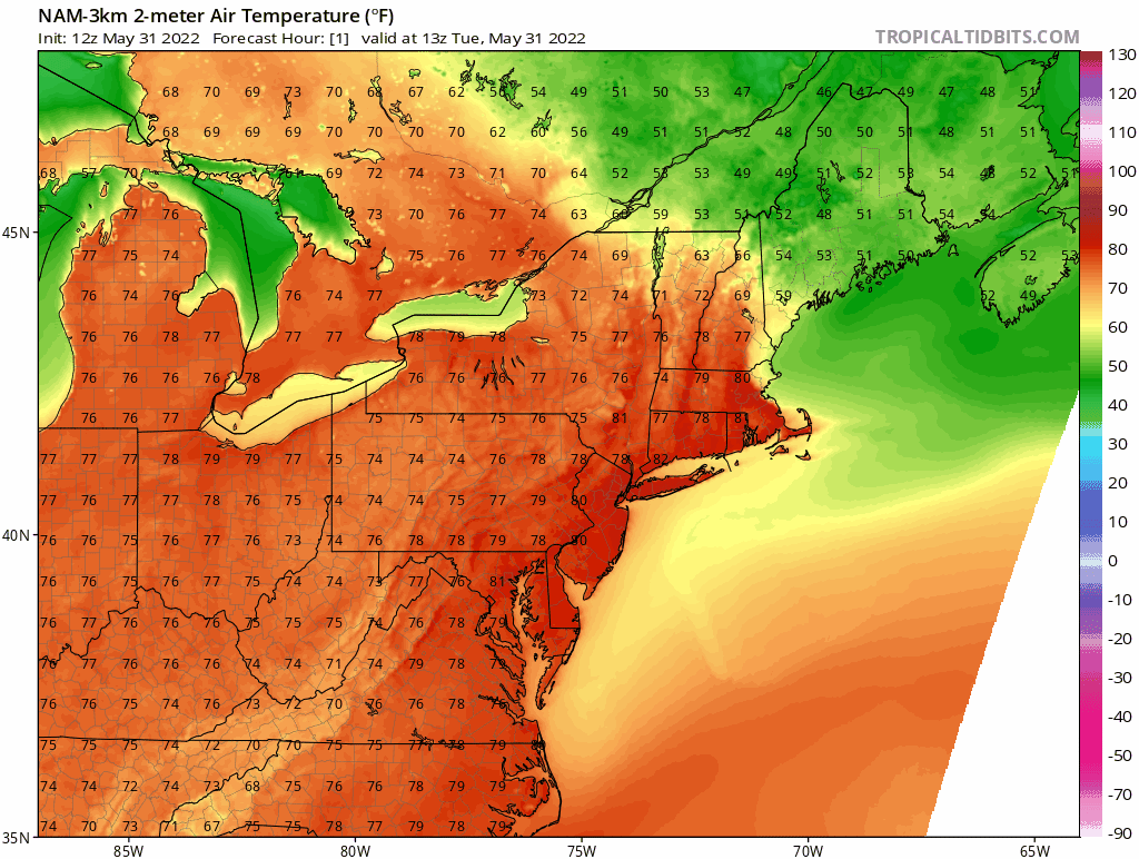 A back door cool front is moving from northeast-to-southwest in the Northeast US resulting in much relief across eastern Massachusetts. This system will usher in cooler Atlantic Ocean air for New York City and New Jersey in the overnight hours. Maps courtesy NOAA, tropicaltidbits.com