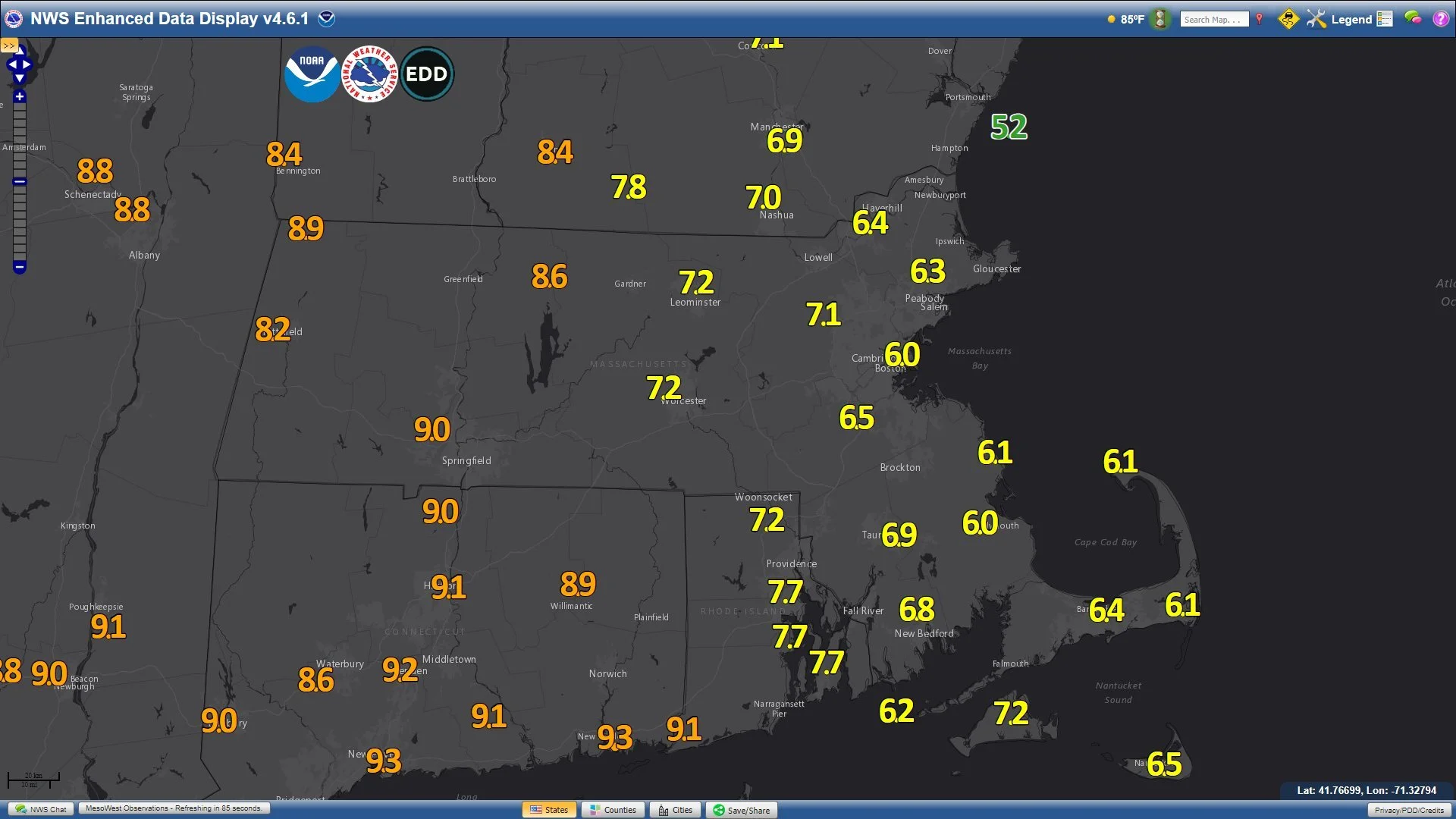 A surface map of southern New England in the early afternoon show temperatures on the cooler side of the back door cool front (in yellow) and on the warmer side (in orange).