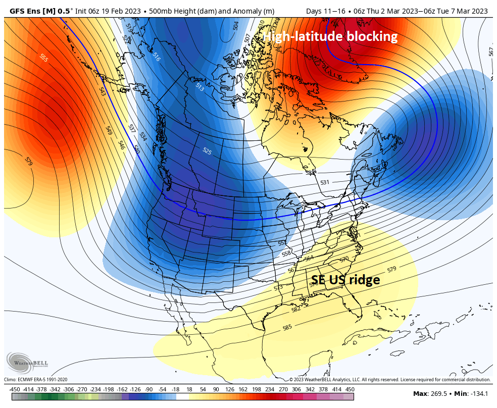 High-latitude blocking is likely to develop across Greenland/Northeastern Canada as we turn from February into March and this new player on the field could battle the persistent Southeast US ridge for dominance in the eastern states. Map courtesy NOAA, Weather Bell