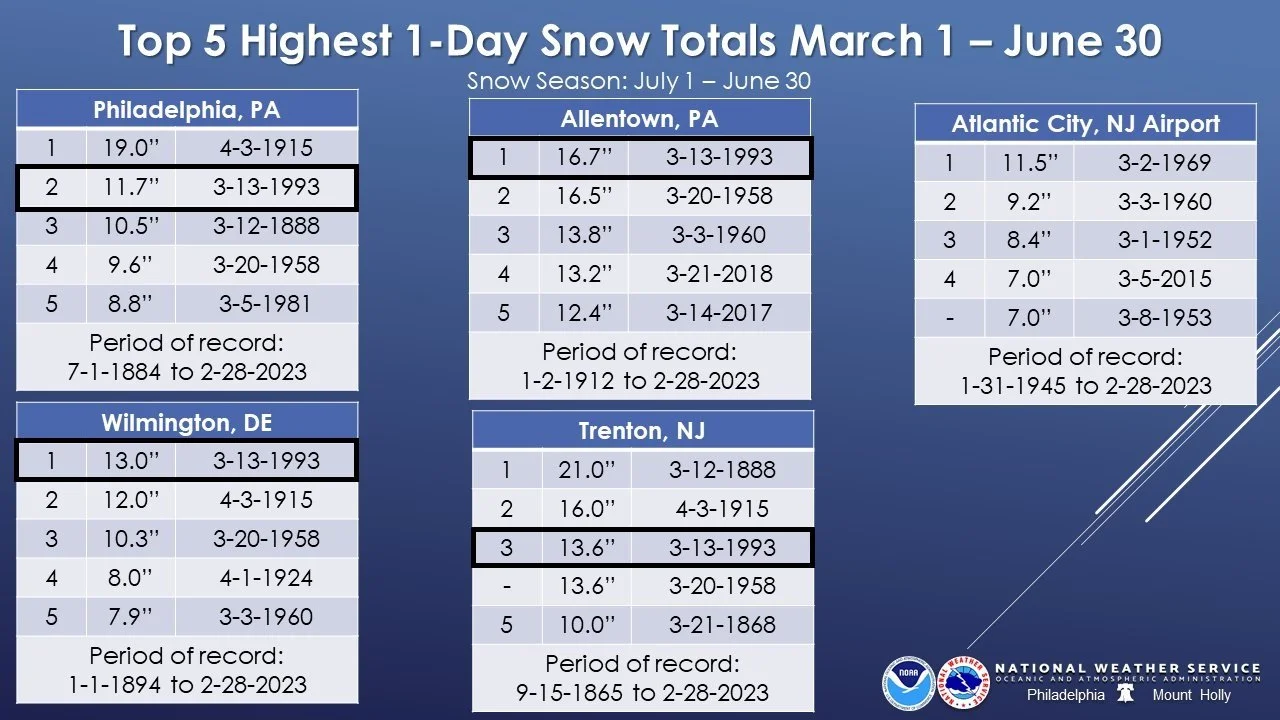 Thirty years later and “The Storm of the Century” still ranks as one of the biggest snowstorms ever recorded during the month of March in the Mid-Atlantic region. Data courtesy NOAA