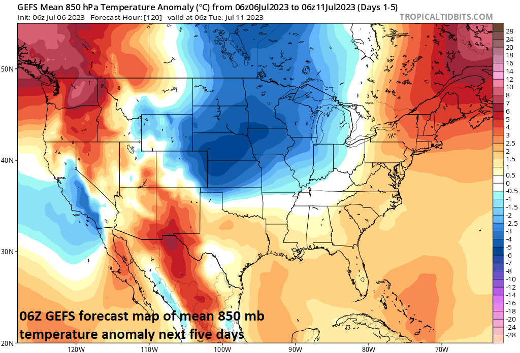 One of the reasons for a continuation of the active weather pattern in the eastern half of the nation is the fact that cooler-than-normal air masses continue to drop into the US from Canada. This kind of pattern generates a “battle zone” region in the US with the cooler-than-normal air to the north and west and warmer-than-normal air to the south and east. Map courtesy NOAA, tropicaltidbits.com