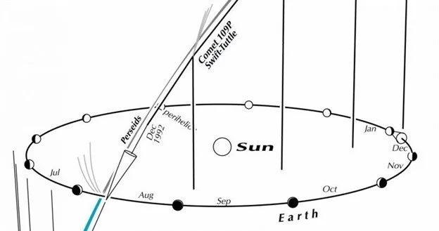The Perseids happen every year in the July/August time period as the Earth crosses the orbital path of Comet Swift-Tuttle. This comet takes about 133 years to orbit the sun and it last rounded the sun in the early 1990s. Credit Earthsky.org/Guy Ottewell.