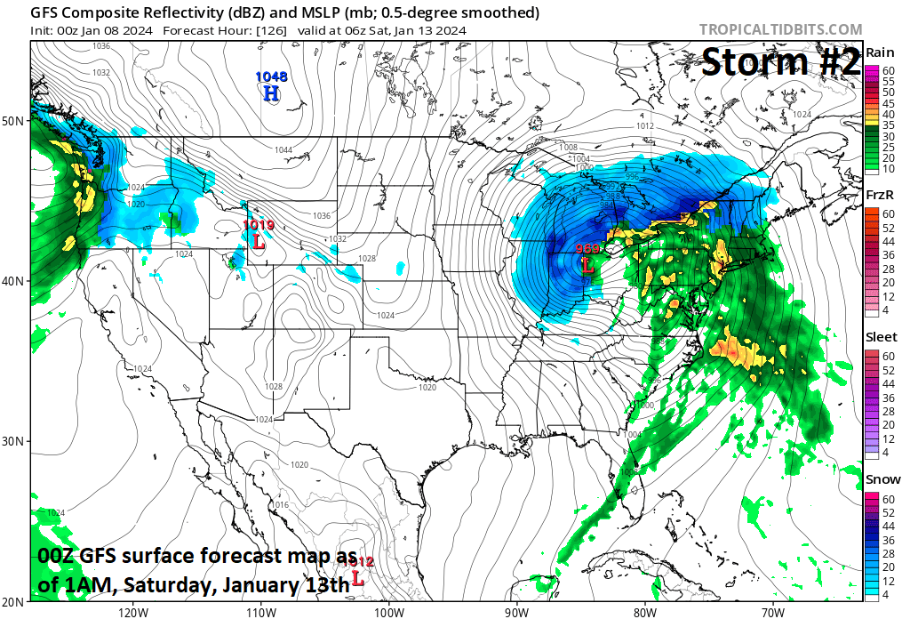 An all-out blizzard is possible at the end of the week/upcoming weekend across much of the Midwest and blizzard conditions may extend to throughout the Great Lakes region as well. In the warm sector, more heavy rainfall is destined for the eastern states and, once again, winds are likely to be quite strong with damage to trees and limbs on the table. Map courtesy NOAA, tropicaltidbits.com