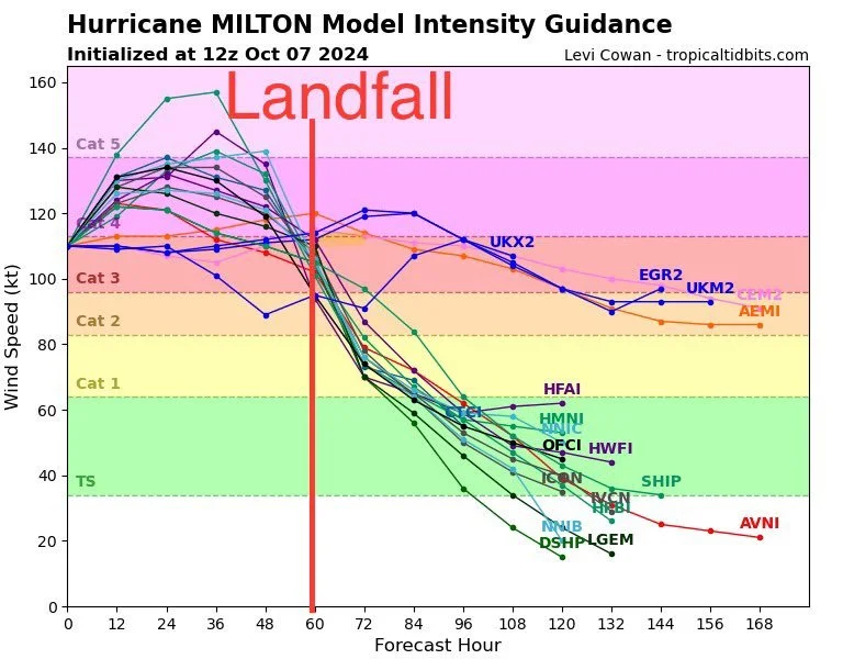Hurricane Milton is likely to reach category 5 status in the very near term and it can weaken some just before landfall due to some “last minute” dry air intrusion. Map courtesy tropicaltidbits.com