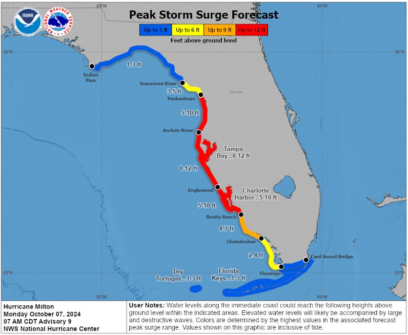 Current indications are that Hurricane Milton may make landfall near or just to the north of Tampa Bay later Wednesday. This would put much of the Tampa Bay region on the right side of the landfalling hurricane which tends to feature the most significant storm surge due to the “additive” effects of the storms forward speed and the powerful surface winds that blow counterclockwise around low pressure systems and, in this case, would push water into Tampa Bay from the Gulf. As a result, the possibility exists for a significant storm surge during this storm of as much as 12 feet in and around the Tampa Bay region.