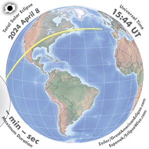 This animated GIF shows the Moon’s shadow arcing across the Pacific, then traversing North America, and ending at sunset not far from Spain. The longest duration will be near Torreon, Mexico at 4 minutes and 27 seconds. The inner black circle, the umbra, is where the shadow is complete — a total eclipse of the Sun. The outer shadow circle, the penumbra, shows the extent of the partial eclipse. The partial eclipse will be slight near the outer circle and deep near the path of totality.