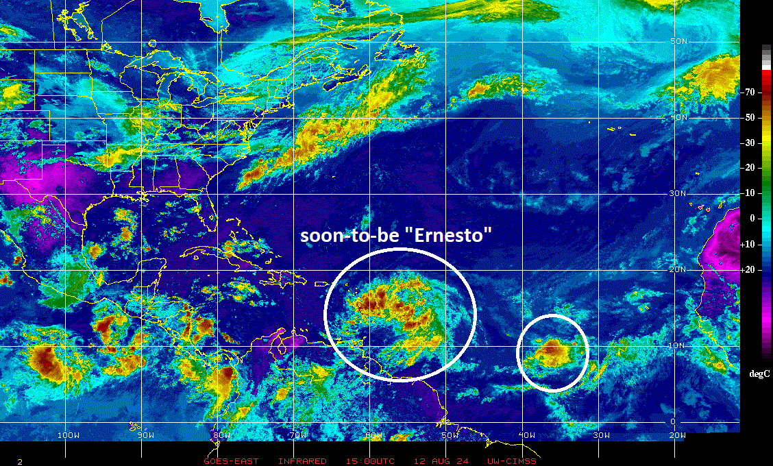 The tropics are likely to remain quite active in the Atlantic Basin during the remainder of August. There are two waves currently with the frontrunning system very likely to become a named tropical storm (Ernesto) in the near-term (left circled region). There is a follow-up system that is close behind that will also need to be monitored in coming days and a third one near the west coast of Africa. Image courtesy University of Wisconsin/CIMSS, NOAA