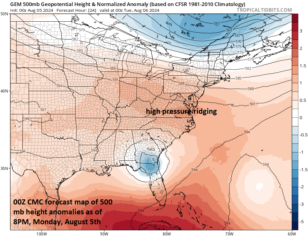 High-pressure ridging in the upper part of the atmosphere builds across the Carolinas/Mid-Atlantic today and this will act to impede the northward progression of Hurricane Debby over the next few days. The slow movement of the tropical storm system will allow for some tremendous rainfall amounts to pile up in the SE US during the next 48-72 hours. Map courtesy Canadian Met Centre