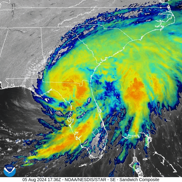 Hurricane Debby made landfall earlier today as a category 1 storm and has weakened to “tropical storm” status. Despite the weakening, this tropical system is likely to produce tremendous rainfall amounts over portions of the SE US during the next few days. Images courtesy NOAA/NESDIS/STAR GOES-East (“Sandwich RGB” Band which combines IR Band 13 with Visual Band 3)