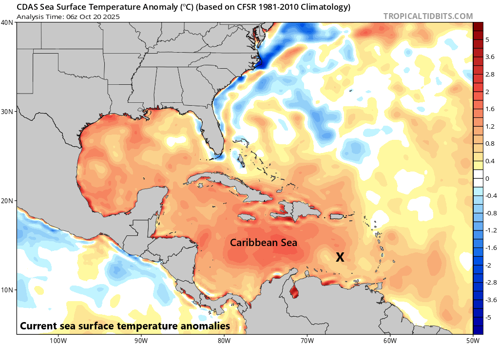 Sea surface temperatures are generally in the middle-to-upper 80’s across the Caribbean Sea which is above-normal for this time of year and still fully supportive of development and intensification of tropical systems at this late stage of the tropical season. In fact, a strong tropical wave has just been officially named (Melissa) by NOAA’s National Hurricane Center having climbed to tropical storm status with maximum sustained winds of 50 mph...this is the first tropical storm so far this year in the Caribbean Sea.
