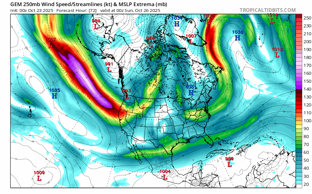 A key player in the active weather pattern expected next week will be a powerful upper-level jet streak that will slam into northern California from the northern Pacific Ocean and then it’ll be “forced” to take a dive to the south-central states as it becomes increasingly influenced by the intense blocking in the atmosphere centered over Canada. Maps courtesy Canadian Met Centre, tropicaltidbits.com