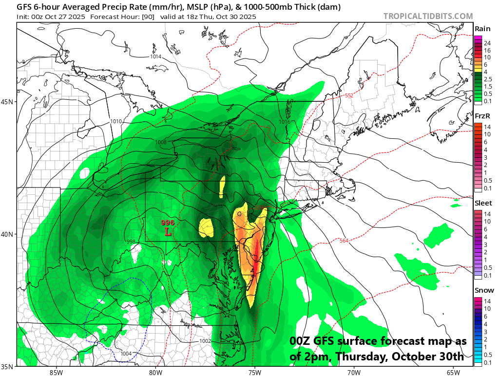 Rain can be heavy at times on Thursday in the Mid-Atlantic region and there can be embedded thunderstorms as well. Map courtesy NOAA, tropicaltidbits.com