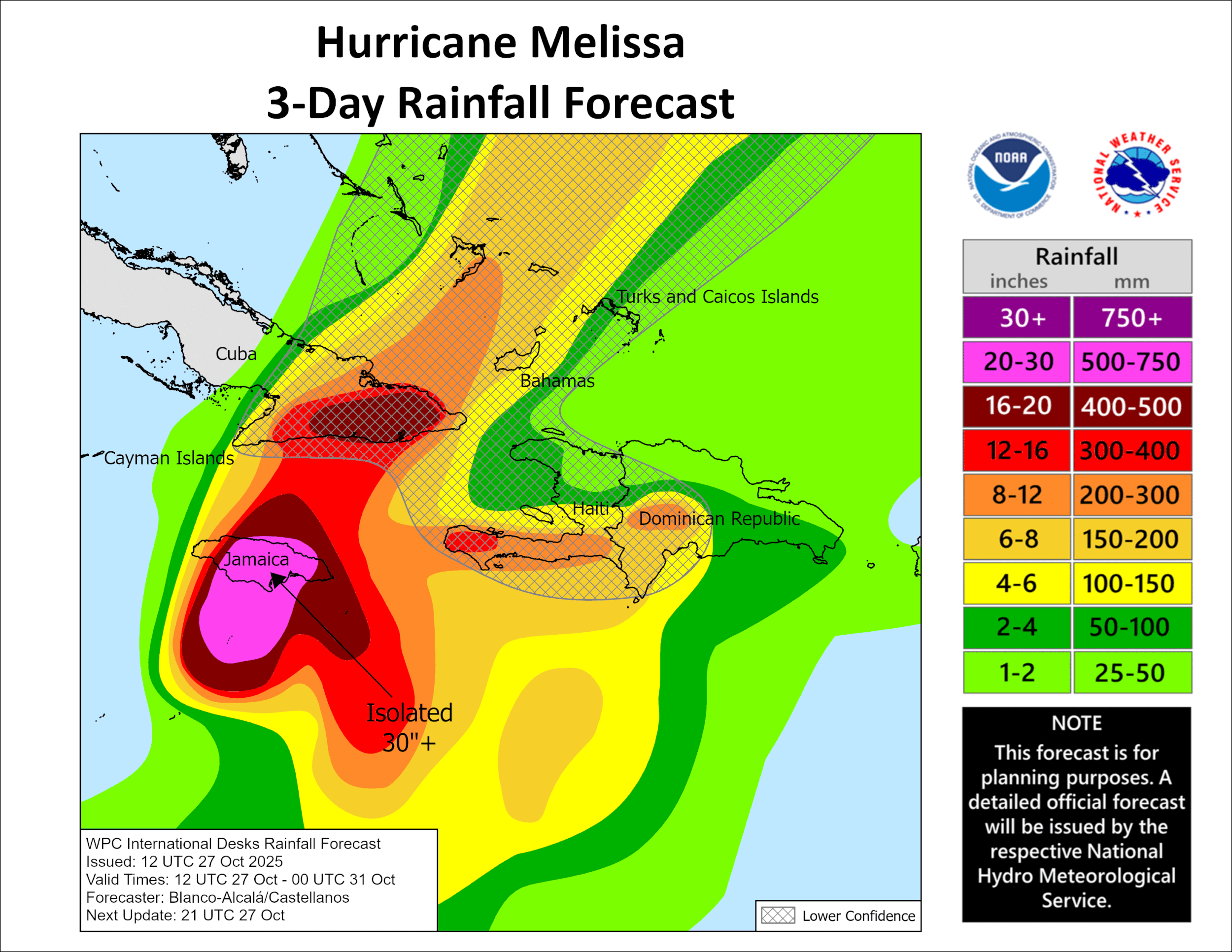Rainfall amounts on Jamaica can end up in the 30-50 inch range given the intensify of Hurricane Melissa and the painstakingly slow movement. Map courtesy NOAA/NHC