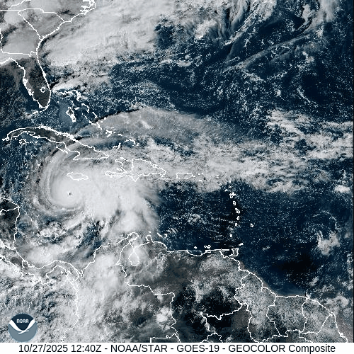 Hurricane Melissa is a category 5 storm with maximum sustained winds of 165 mph. This storm system is south of Jamaica and will turn to the northwest and then north by later tonight likely bringing a Tuesday morning landfall on the southern coast of Jamaica. Images courtesy NOAA/GOES-East