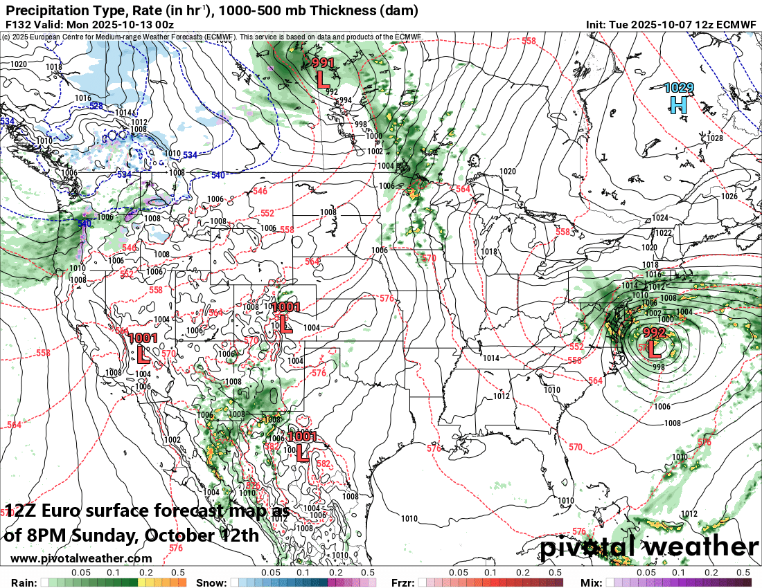 The latest run of the European forecast model (at 12Z) features a strong storm system just off the Mid-Atlantic coastline by Sunday evening. Map courtesy ECMWF, Pivotal Weather