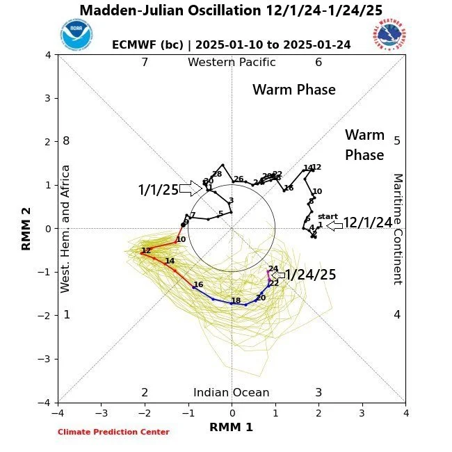 The MJO was in a different position during the month of December last winter with a rotation through (warmer) phases 5 and 6 between 12/1/24 and 1/1/25. Plot courtesy NOAA