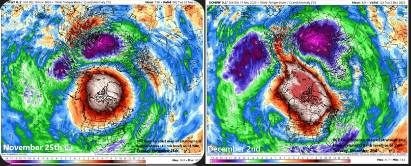 Significant stratospheric warming will take place in coming days and it appears it may happen on two occasions with a “relaxation” in between. The forecast map of 10 mb temperature anomalies on the left features significant stratospheric warming on November 25th and then a second such occurrence on December 2nd (right). Maps courtesy ECMWF