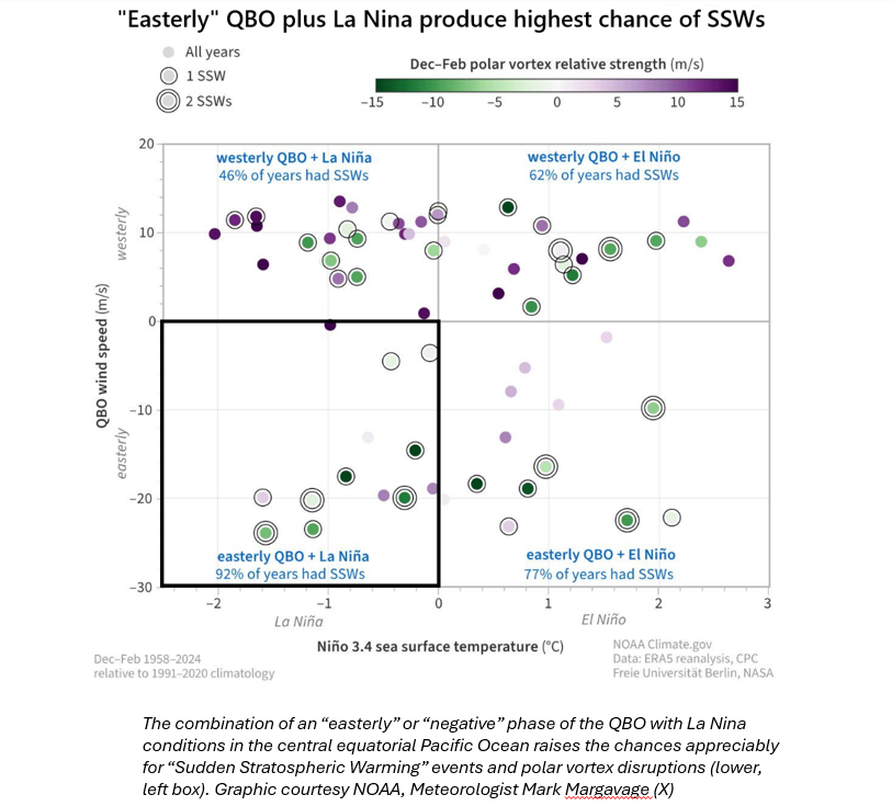 When an “easterly” or “negative” phase of the QBO is combined with La Nina, there is a strong tendency for an increase in “Stratospheric Warming” events and the disruption of the polar vortex, a weaker Atlantic jet stream, and cold winters in northern Europe and the eastern US. Stratospheric Warming events and the disruption of the polar vortex in the Northern Hemisphere in winter characteristically increase the chance for Arctic air outbreaks to reach the lower latitudes from the higher latitudes. The “easterly” phase also encourages a negative North Atlantic Oscillation (NAO), which can funnel cold air into North America.