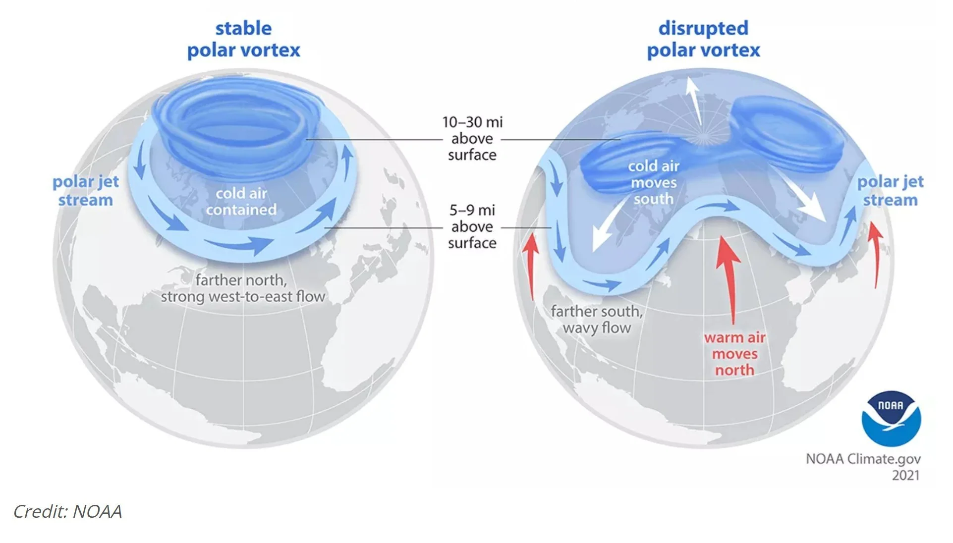 In a stable polar vortex circumstance (left), strong westerly (or zonal) winds surround the vortex to its south (e.g., at around 60 degrees N). In a Stratospheric Warming event, the polar vortex can become disrupted or weakened (right), the polar jet stream “buckles”, and this can unleash Arctic air masses from the high latitudes to the middle latitudes. Graphic courtesy NOAA