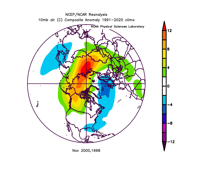 Two examples of November Stratospheric Warming events occurred in 1968 and 2000 and the 10 mb temperatures averaged well above-normal in the polar region. Map courtesy NOAA