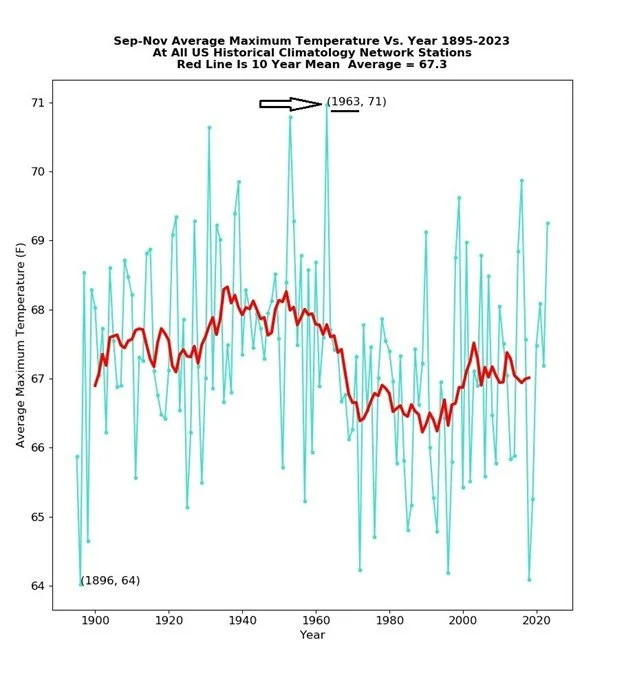 The fall season of “September through November” in 1963 was arguably one of the warmest autumns ever across the nation as indicated by this plot of average maximum temperatures at US Historical Climatology Network (USHCN) weather stations. Map courtesy NOAA, Tony Heller (X)
