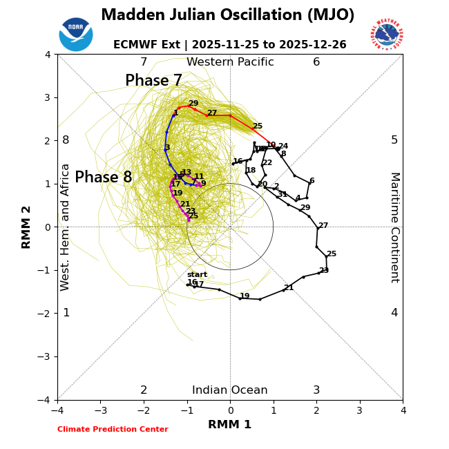 The Madden-Julian Oscillation or MJO will move through “phase 7” in coming days and then likely reach “phase 8” by the middle of December. Typically, a movement of the MJO into “phase 7” this time of year helps to set the stage for cold air to be delivered to the US, and “phase 8” is when the cold air is actually delivered on a consistent basis. Plot courtesy NOAA, ECMWF